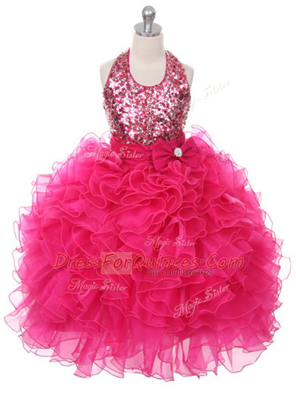 Excellent Hot Pink Little Girls Pageant Dress Wholesale Wedding Party with Ruffles and Sequins and Bowknot Scoop Sleeveless Lace Up