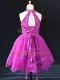Halter Top Sleeveless Little Girl Pageant Dress Mini Length Beading and Lace Fuchsia Organza