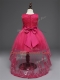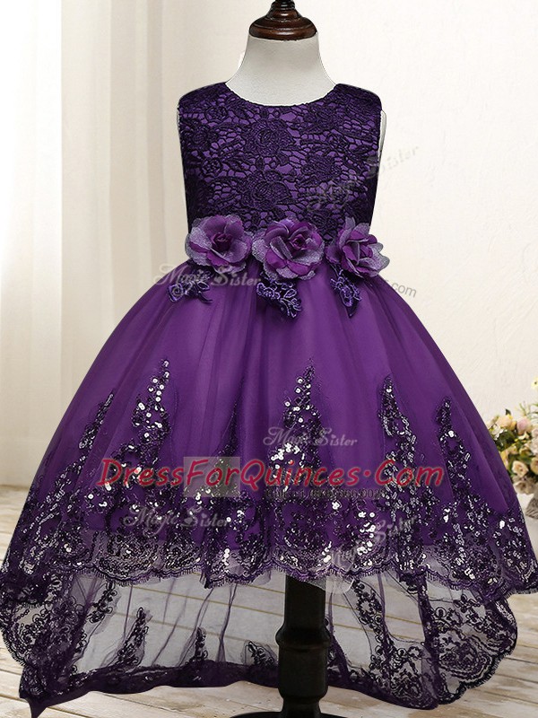 High Low Zipper Kids Formal Wear Dark Purple for Wedding Party with Lace and Appliques and Bowknot and Hand Made Flower