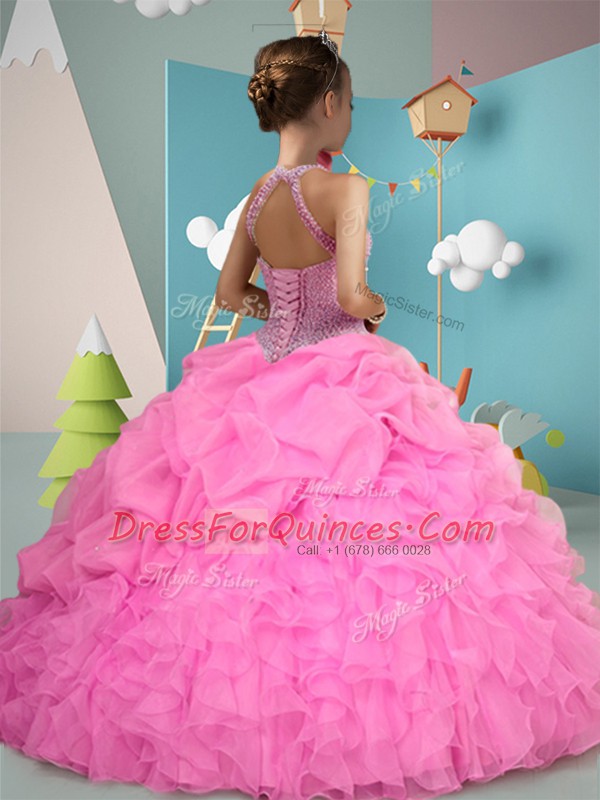 Hot Pink and Apple Green Organza Lace Up Little Girl Pageant Gowns Sleeveless Floor Length Ruffles