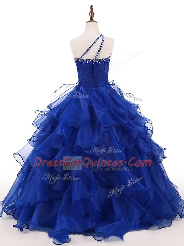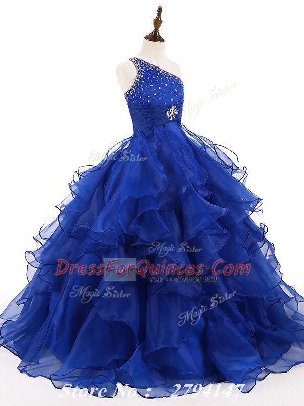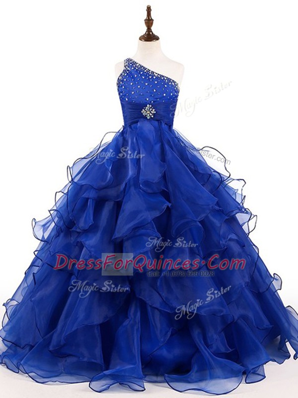 Inexpensive Sleeveless Floor Length Beading and Ruffles Zipper Pageant Gowns For Girls with Royal Blue