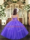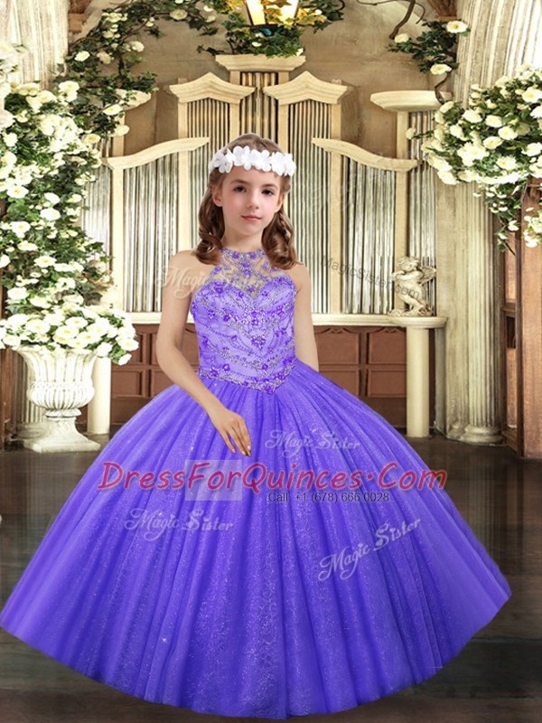 Lavender Tulle Lace Up Little Girl Pageant Gowns Sleeveless Floor Length Beading and Ruffles