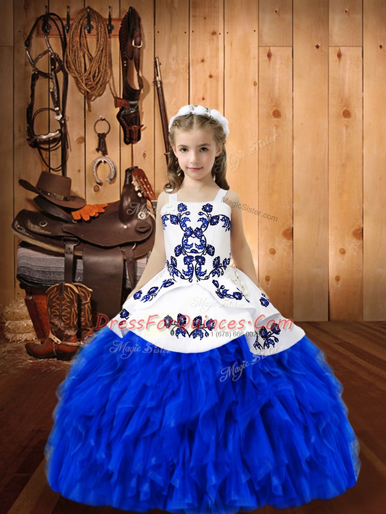 Low Price Straps Sleeveless Kids Pageant Dress Floor Length Embroidery and Ruffles Royal Blue Organza