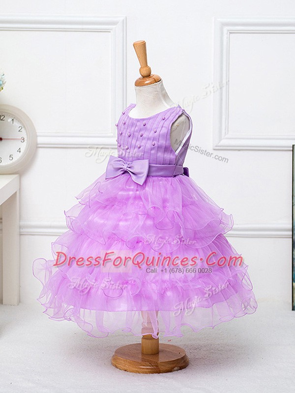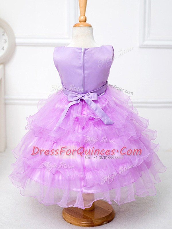 Organza Scoop Sleeveless Zipper Ruffled Layers and Bowknot Little Girls Pageant Gowns in Lilac