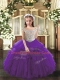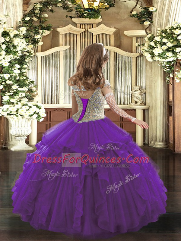 Perfect Purple Organza Lace Up Off The Shoulder Sleeveless Floor Length Child Pageant Dress Beading and Ruffles