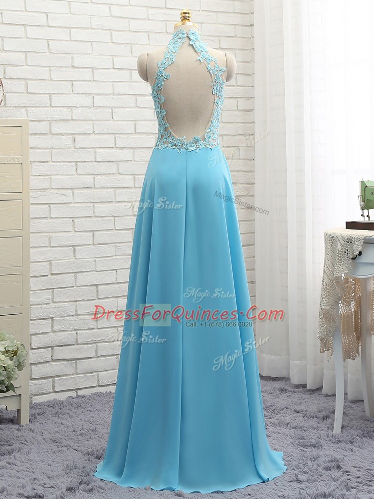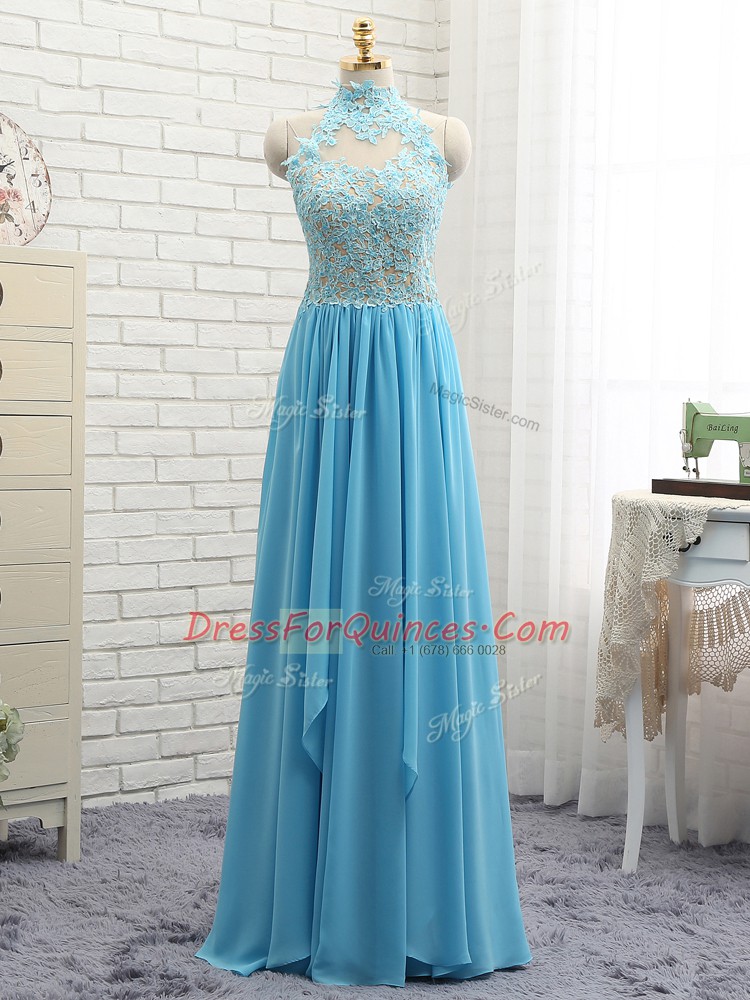 Affordable Baby Blue Halter Top Neckline Lace Prom Gown Sleeveless Backless
