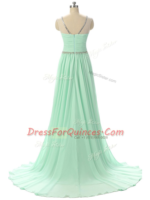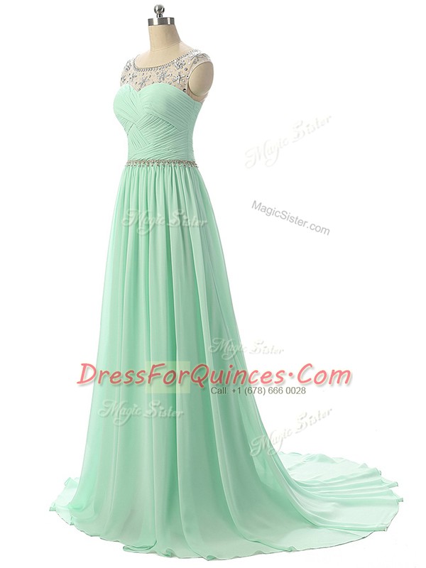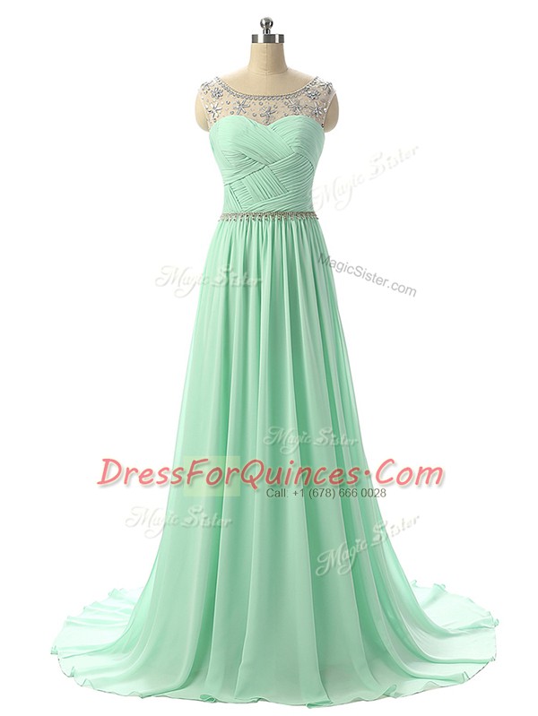 Apple Green Zipper Scoop Beading and Ruching Dress for Prom Chiffon Sleeveless Brush Train