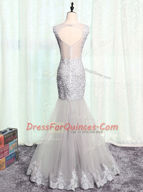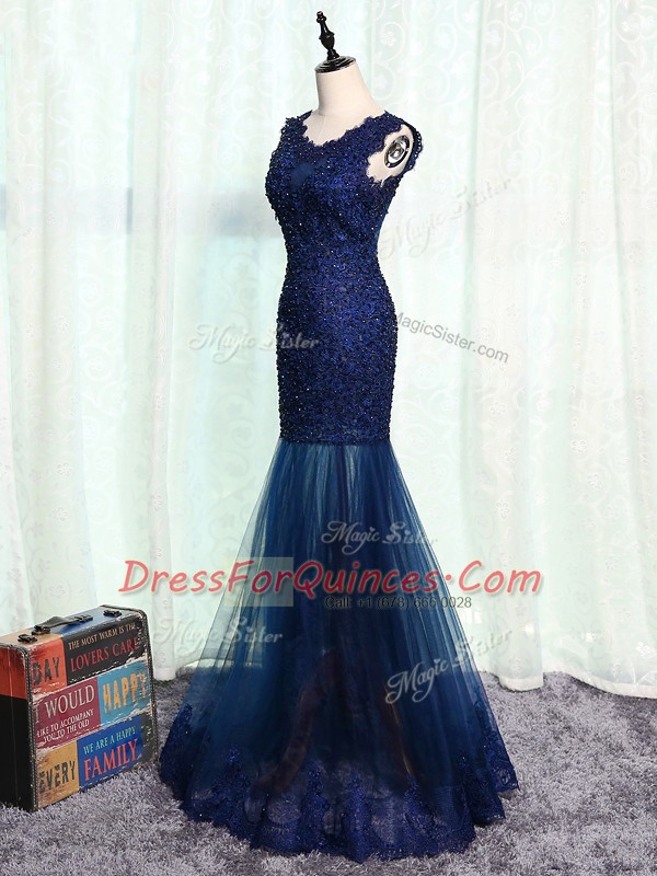 Beauteous Sleeveless Floor Length Beading and Lace and Appliques Zipper Evening Dress with Navy Blue