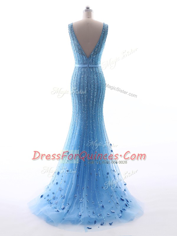 Beautiful V-neck Sleeveless Tulle Evening Dress Beading and Belt and Hand Made Flower Zipper