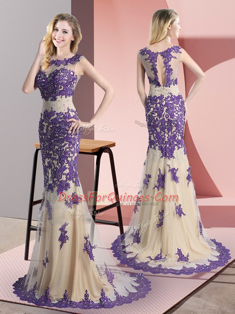 Champagne Evening Dress Tulle Sweep Train Sleeveless Beading and Appliques