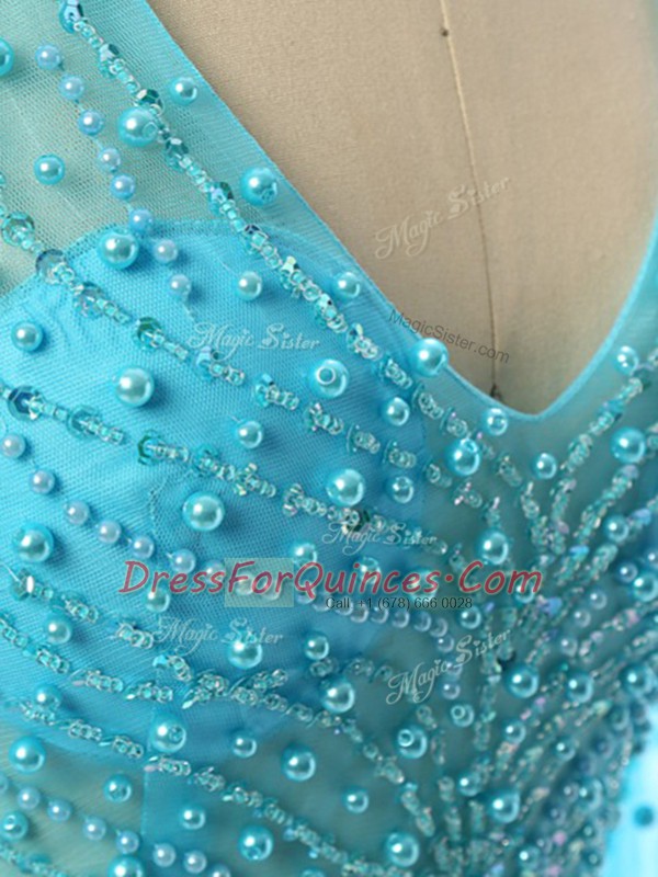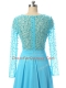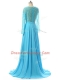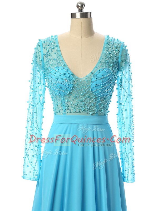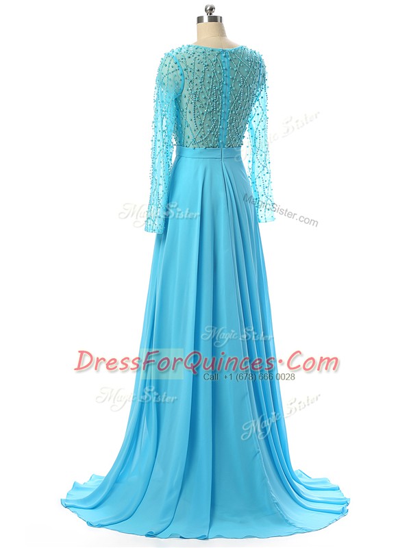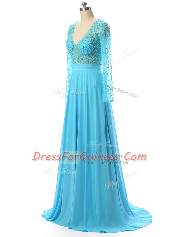Comfortable Baby Blue Chiffon Zipper V-neck Long Sleeves Prom Evening Gown Brush Train Beading