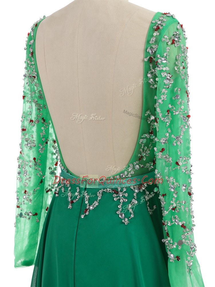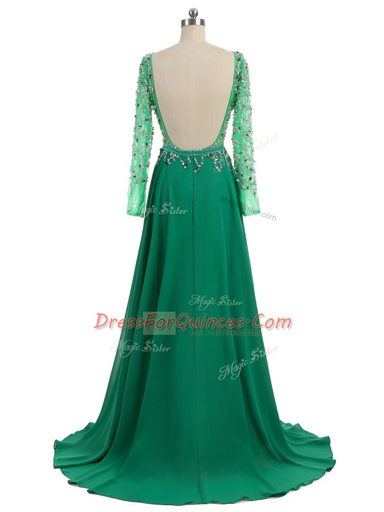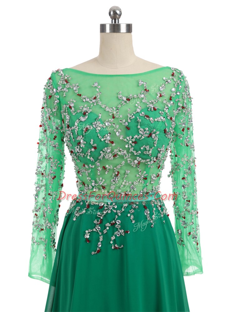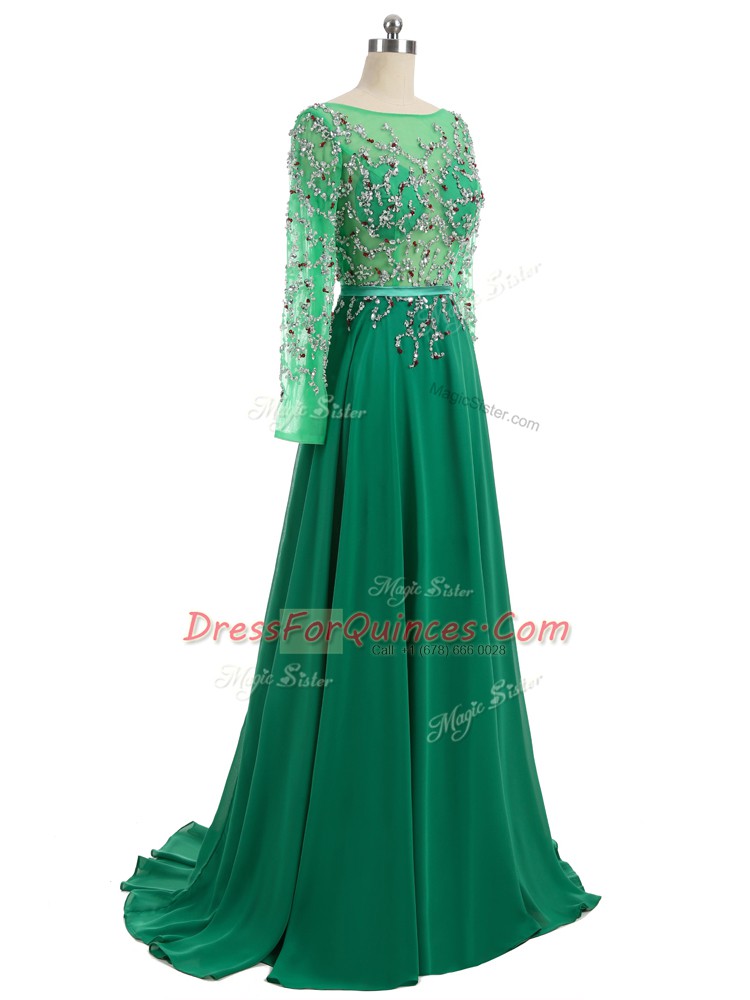 Dynamic Green Evening Dress Prom and Party and Military Ball with Beading Bateau Long Sleeves Brush Train Backless