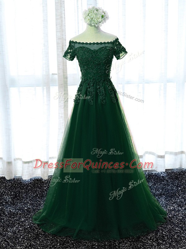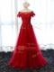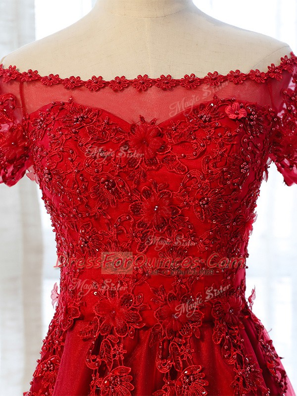 Glorious Lace and Appliques Prom Evening Gown Red Lace Up Short Sleeves Floor Length