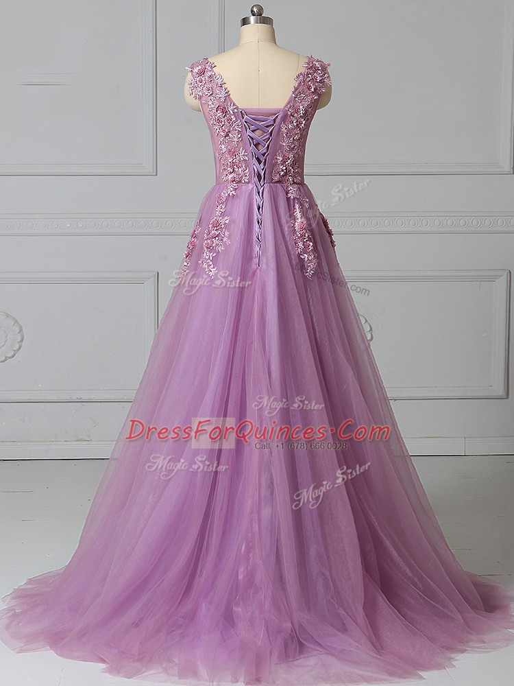 Lilac Scoop Neckline Appliques and Pattern Prom Evening Gown Sleeveless Lace Up