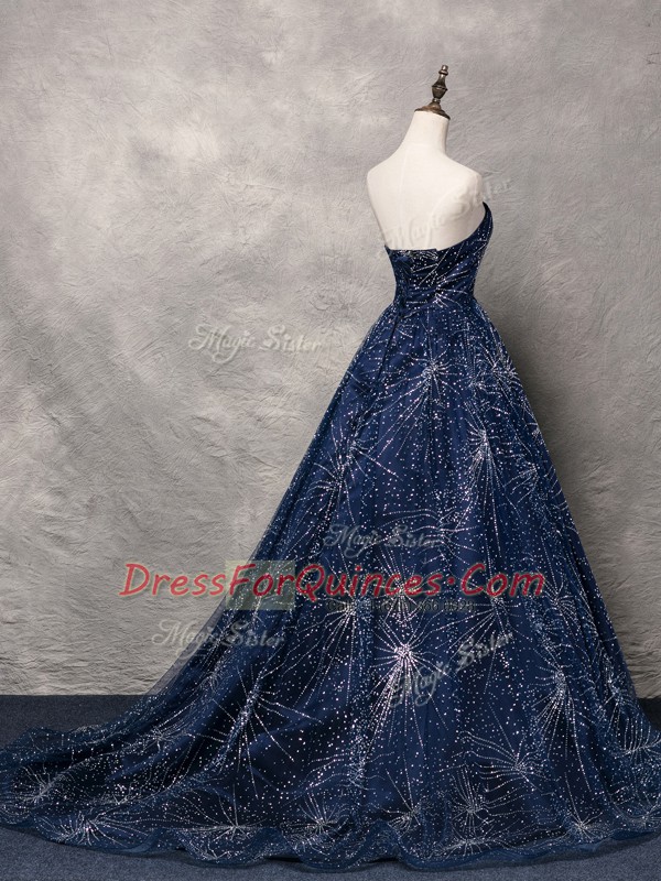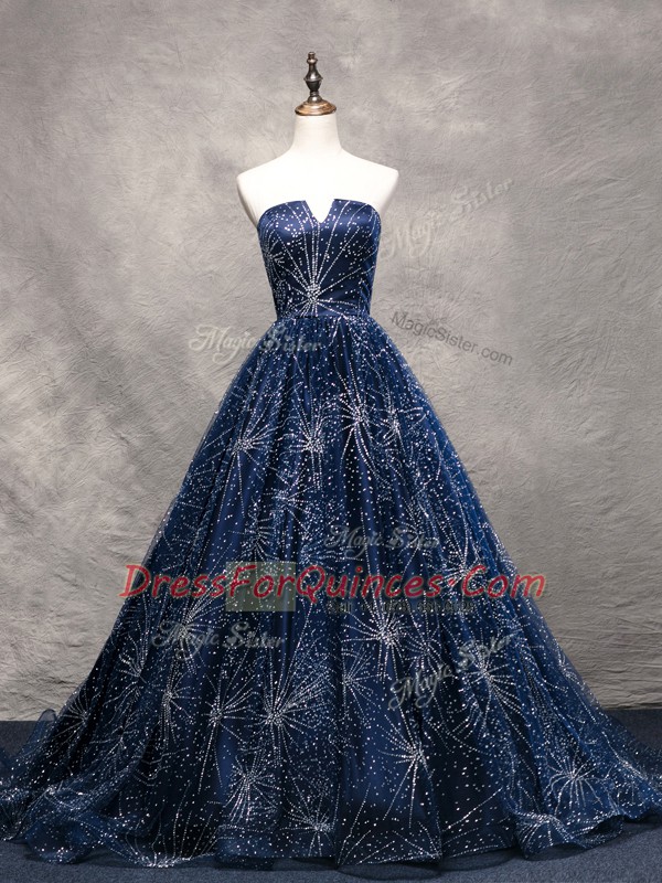 Navy Blue Prom Party Dress Prom and Military Ball with Beading V-neck Sleeveless Brush Train Lace Up