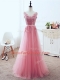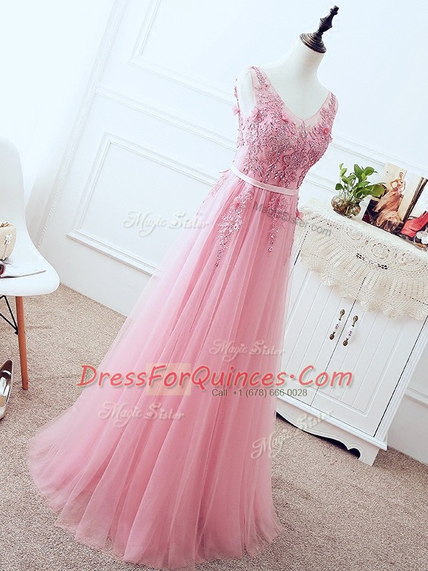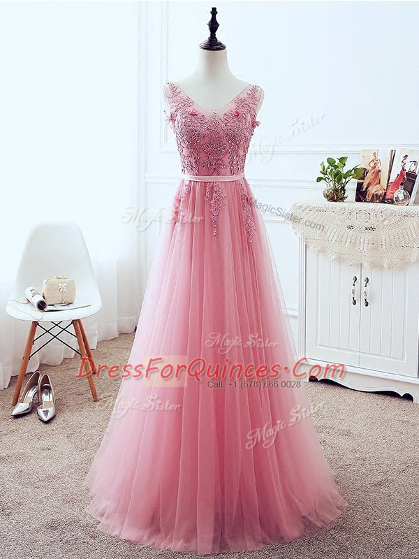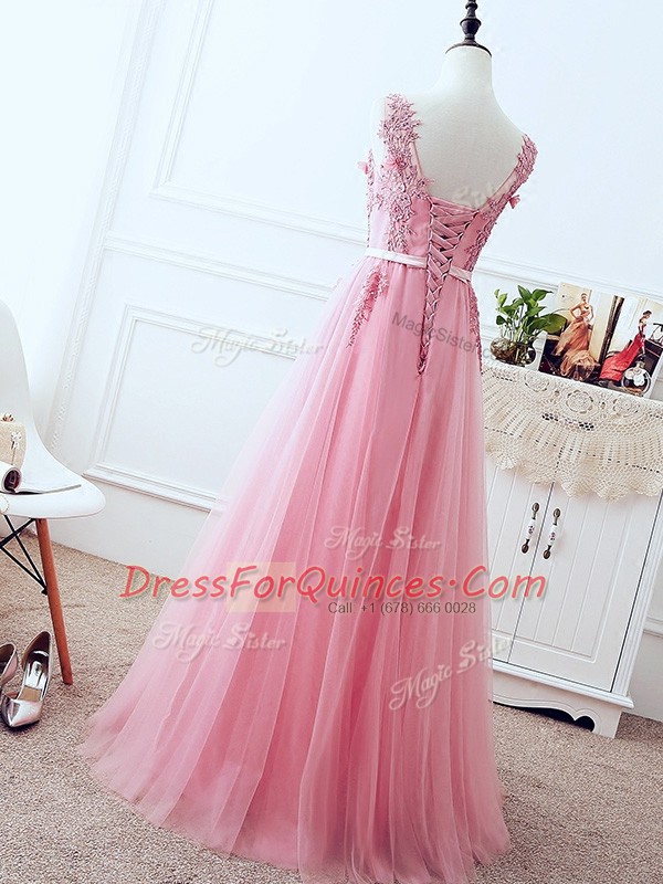 Pink Tulle Lace Up V-neck Sleeveless Floor Length Prom Dress Lace and Appliques and Belt