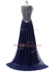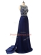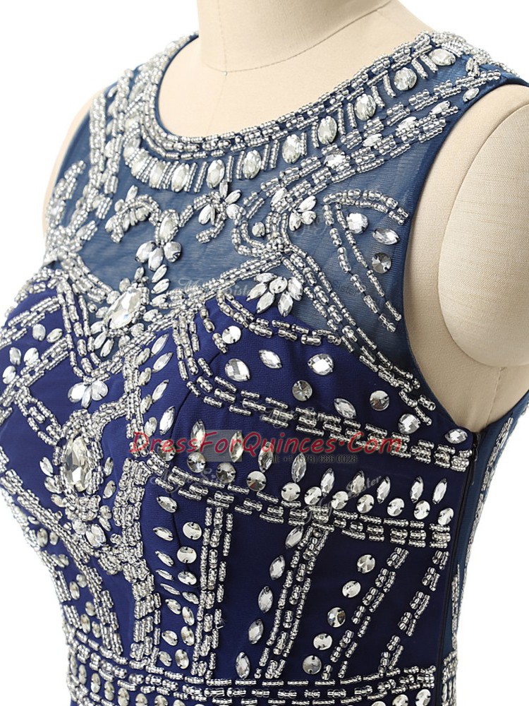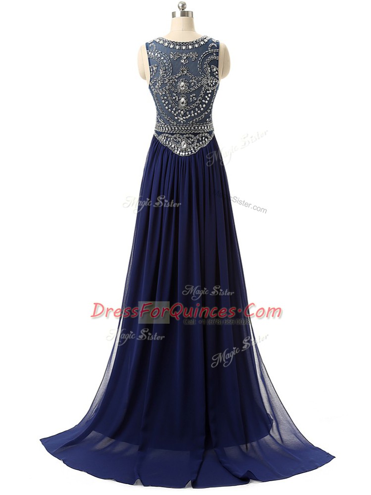 Scoop Sleeveless Brush Train Zipper Evening Dress Navy Blue Chiffon