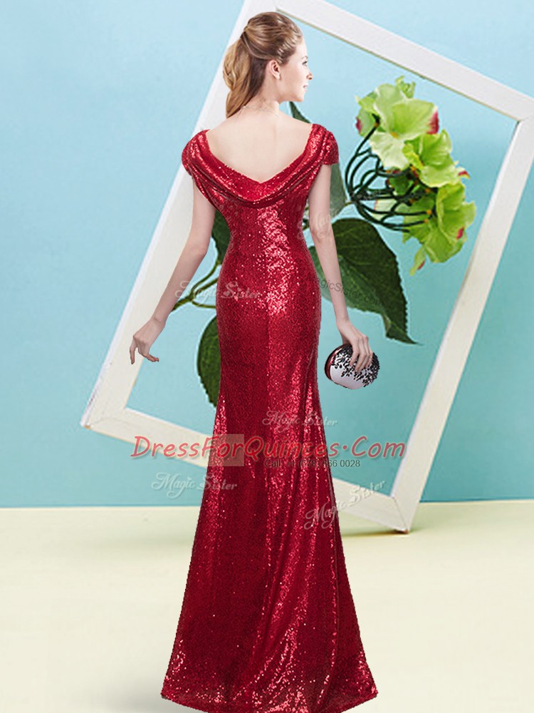 Sequins Homecoming Dress Wine Red Zipper Cap Sleeves Floor Length