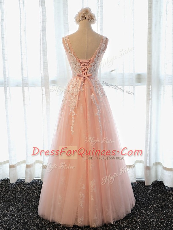 Shining Peach A-line Appliques Prom Dresses Lace Up Tulle Sleeveless Floor Length