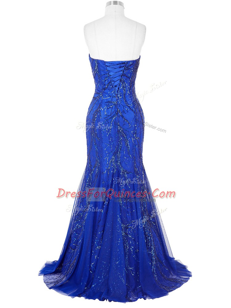 Traditional Royal Blue Mermaid Sweetheart Sleeveless Tulle Brush Train Lace Up Sequins Dress for Prom
