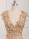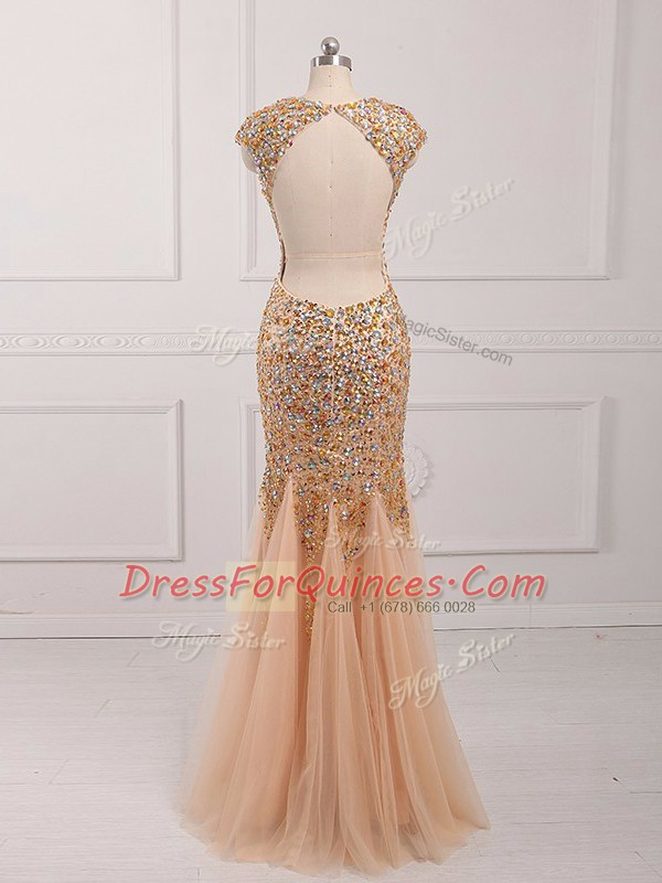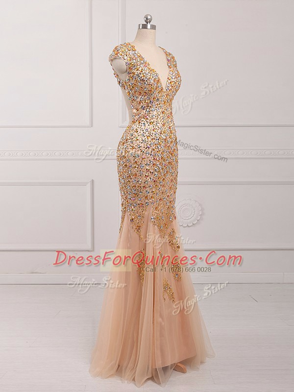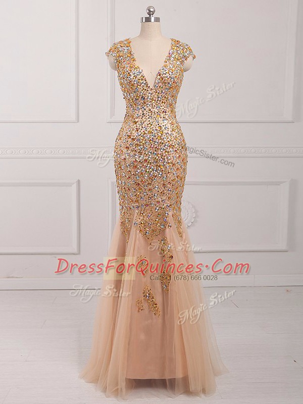 V-neck Cap Sleeves Prom Dress Beading Champagne Tulle