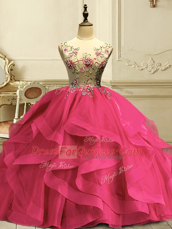 Admirable Appliques and Ruffles Sweet 16 Dresses Hot Pink Lace Up Sleeveless Floor Length
