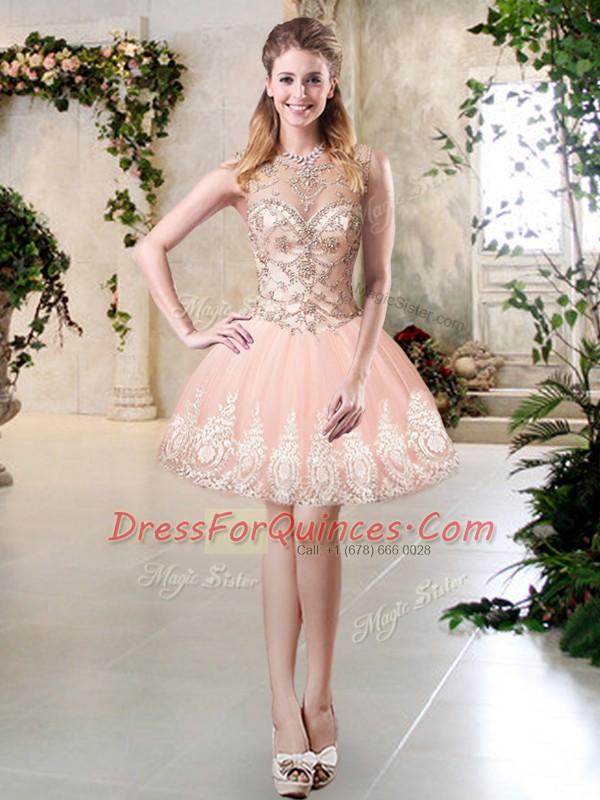 Amazing Sleeveless Floor Length Beading and Lace and Appliques Backless Quinceanera Gowns with Peach
