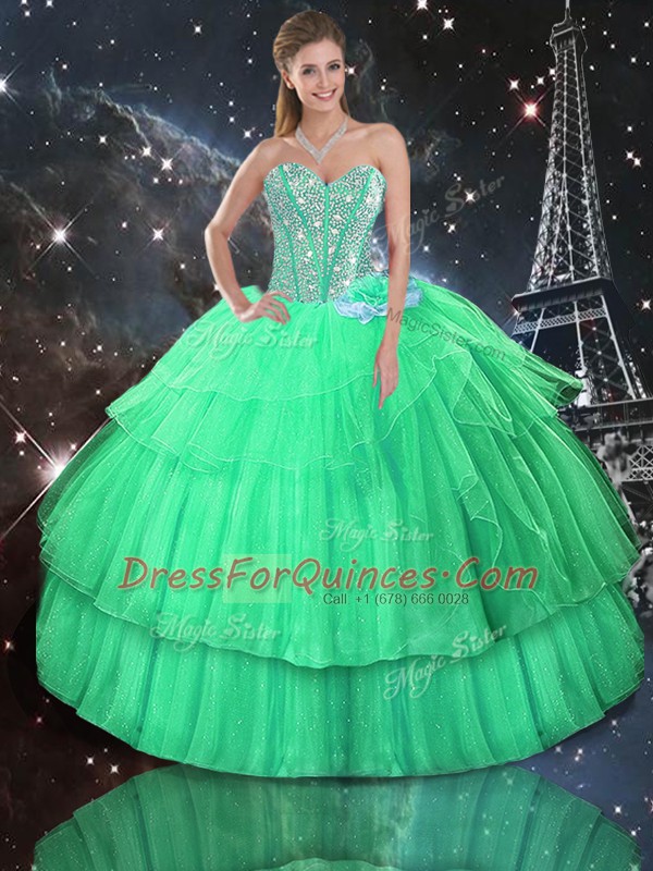 Apple Green Organza Lace Up Sweetheart Sleeveless Floor Length 15th Birthday Dress Ruffled Layers and Sequins