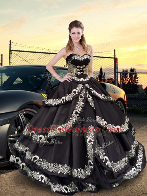 Black Quinceanera Dress Military Ball and Sweet 16 and Quinceanera with Embroidery and Ruffled Layers Sweetheart Sleeveless Lace Up