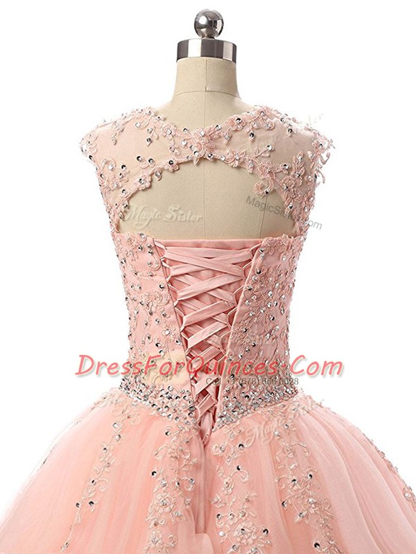 Cheap Scoop Sleeveless Sweet 16 Dresses Floor Length Beading and Lace Peach Tulle