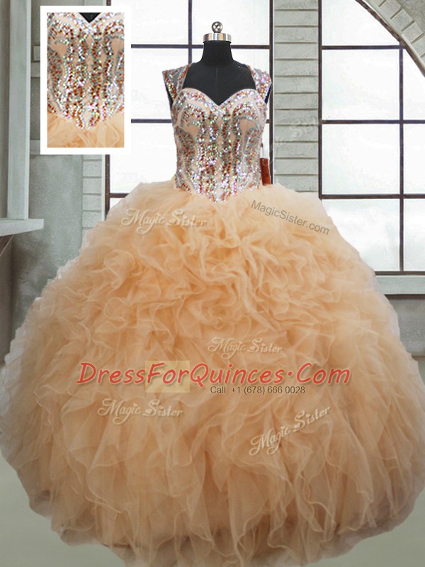 Dazzling Floor Length Lace Up Sweet 16 Dresses Champagne for Military Ball and Sweet 16 and Quinceanera with Beading and Ruffles