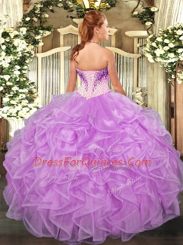 Delicate Floor Length Lavender Quince Ball Gowns Organza Sleeveless Beading and Ruffles