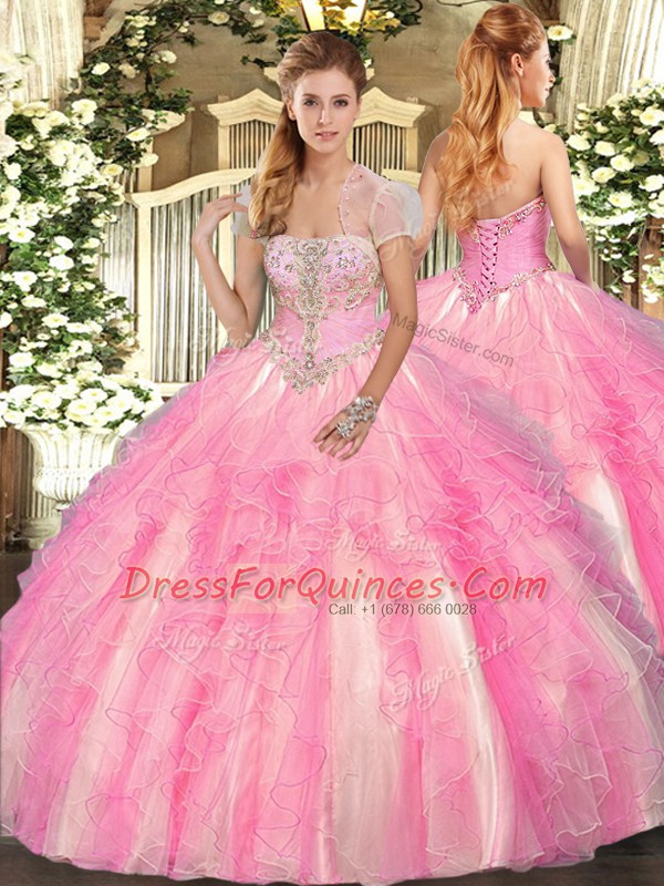 Deluxe Ball Gowns Sweet 16 Quinceanera Dress Rose Pink Strapless Tulle Sleeveless Floor Length Lace Up