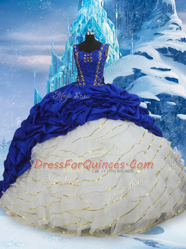 Designer Blue And White Sleeveless Taffeta Brush Train Lace Up Sweet 16 Quinceanera Dress for Military Ball and Sweet 16 and Quinceanera