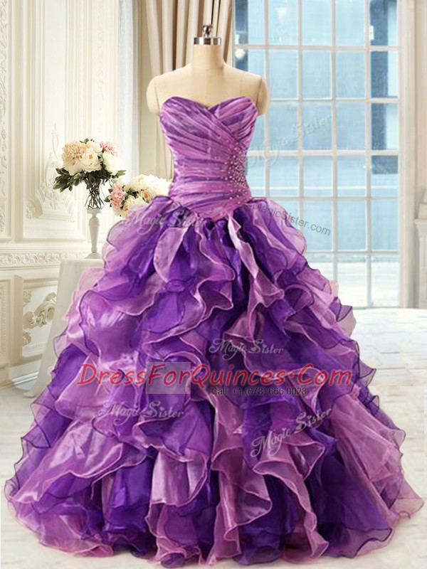 Eggplant Purple Sleeveless Floor Length Beading and Ruffles Lace Up Ball Gown Prom Dress