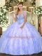 Elegant Sleeveless Floor Length Appliques and Ruffles Lace Up Sweet 16 Quinceanera Dress with Light Blue