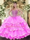 Floor Length Rose Pink Sweet 16 Dresses Organza Sleeveless Beading and Ruffled Layers