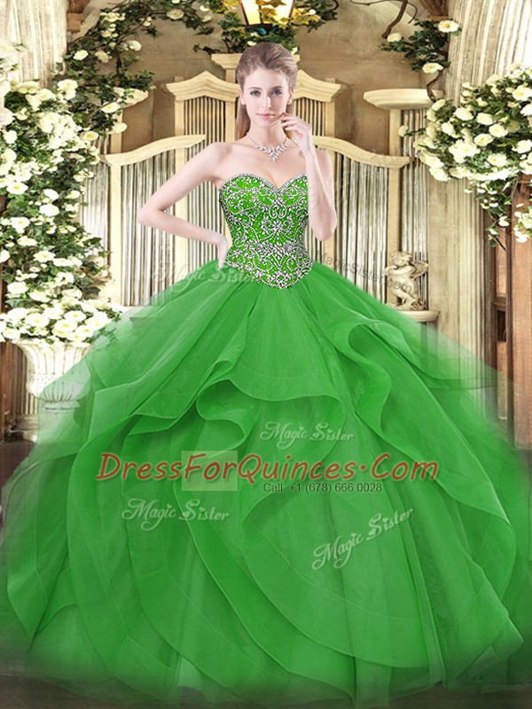 Green Ball Gowns Tulle Sweetheart Sleeveless Beading and Ruffles Floor Length Lace Up Ball Gown Prom Dress