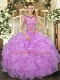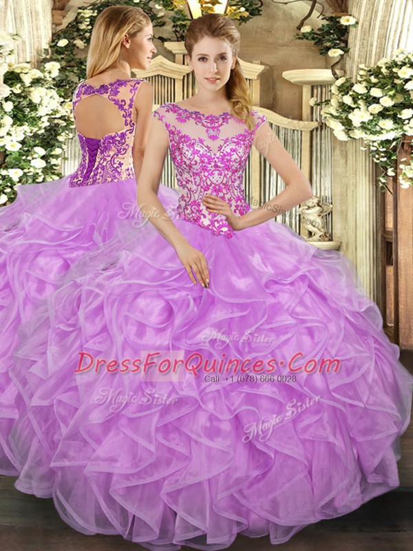 Lilac Cap Sleeves Floor Length Beading and Appliques and Ruffles Lace Up Vestidos de Quinceanera