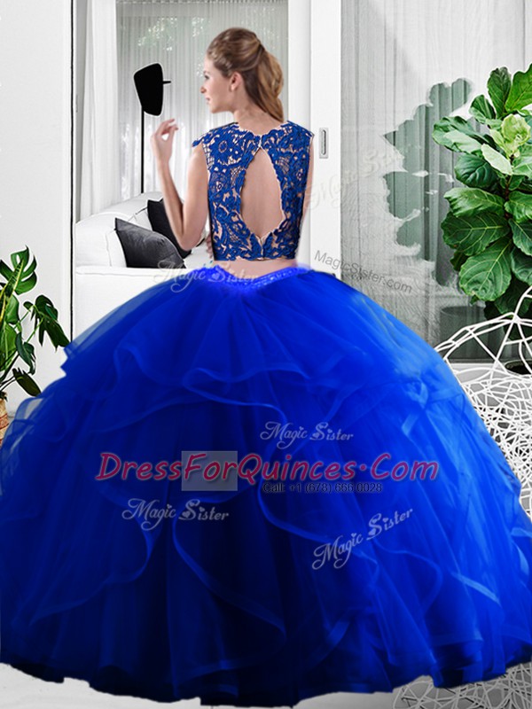 Luxury Sleeveless Tulle Floor Length Zipper 15th Birthday Dress in Turquoise with Lace and Ruffles