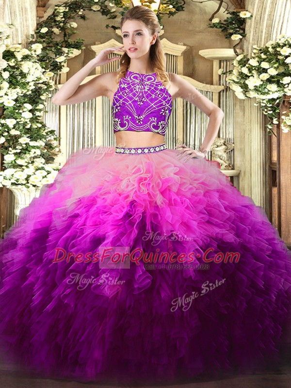 Multi-color Tulle Zipper High-neck Sleeveless Floor Length 15th Birthday Dress Beading and Ruffles