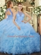 Organza Halter Top Sleeveless Lace Up Beading and Ruffles and Pick Ups Quinceanera Gown in Aqua Blue