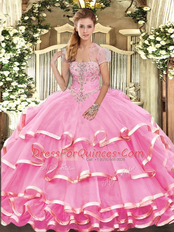 Rose Pink Lace Up Strapless Appliques and Ruffled Layers Quinceanera Dresses Organza Sleeveless
