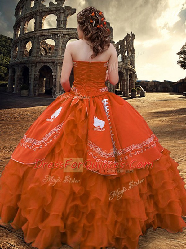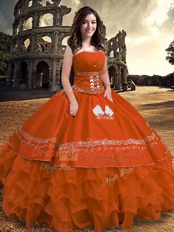Rust Red Strapless Zipper Embroidery and Ruffled Layers Sweet 16 Quinceanera Dress Sleeveless