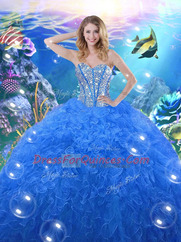 Sweetheart Sleeveless Ball Gown Prom Dress Floor Length Beading and Ruffles Royal Blue Organza
