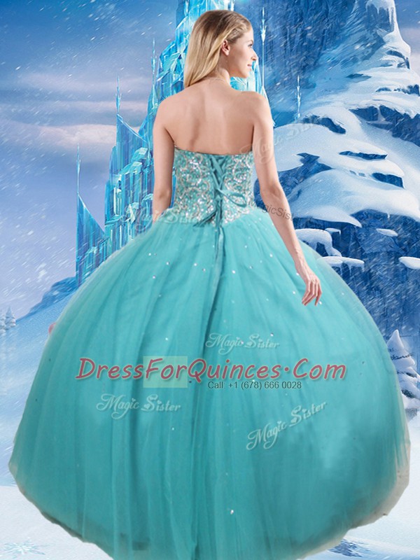 Trendy Aqua Blue Sleeveless Floor Length Beading and Sequins Lace Up Quinceanera Gown