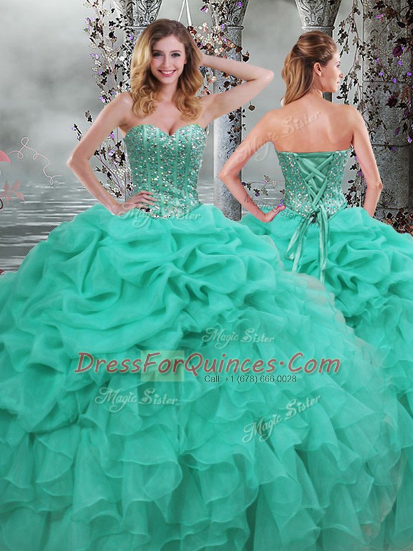 Turquoise Sleeveless Floor Length Beading and Ruffles Lace Up Quince Ball Gowns