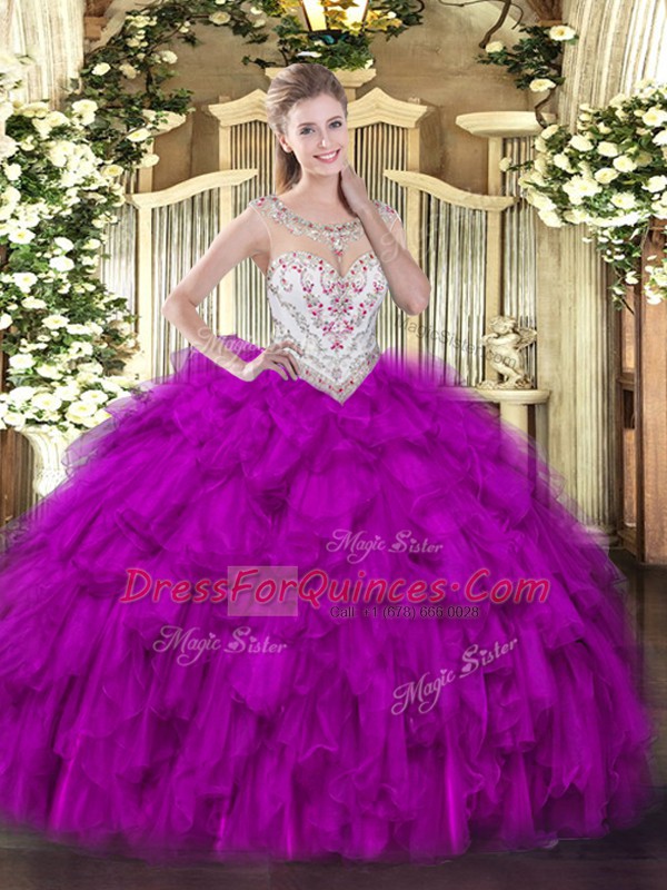 Unique Fuchsia Zipper Scoop Beading and Ruffles Sweet 16 Quinceanera Dress Tulle Sleeveless