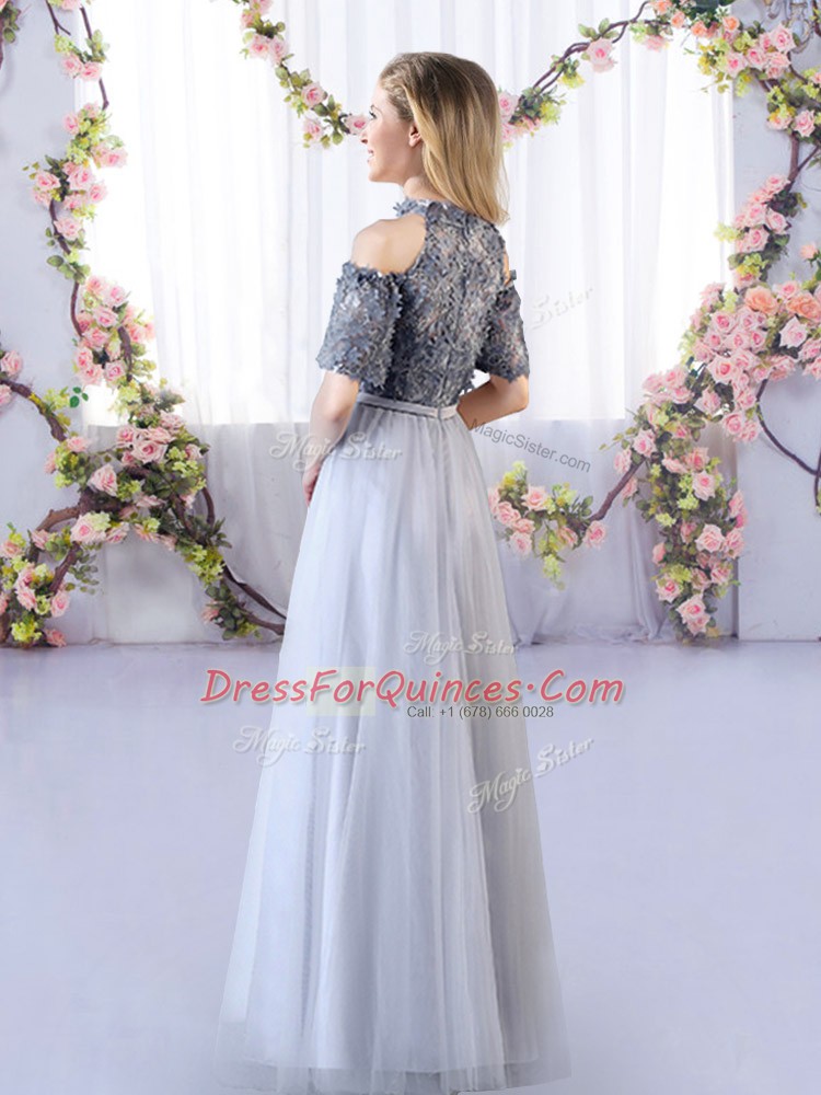 Appliques Dama Dress for Quinceanera Grey Zipper Short Sleeves Floor Length