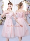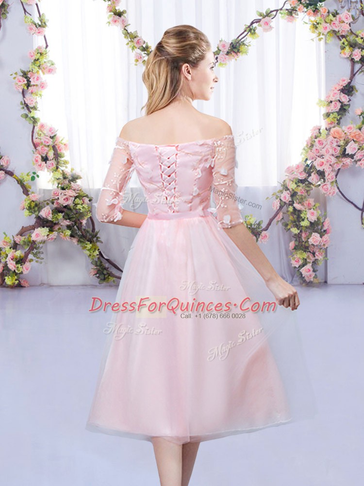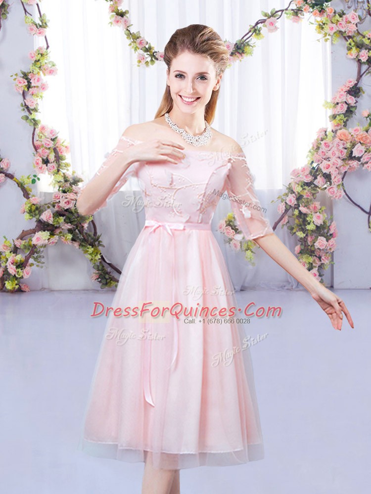 Baby Pink Off The Shoulder Neckline Lace and Belt Quinceanera Dama Dress Half Sleeves Lace Up